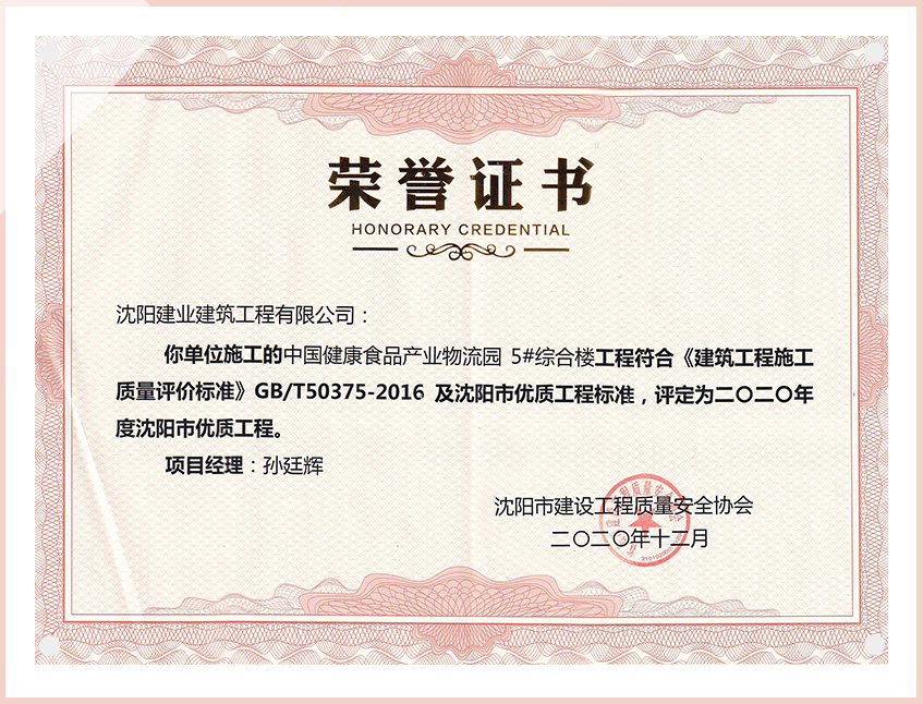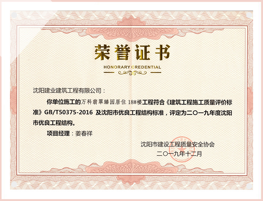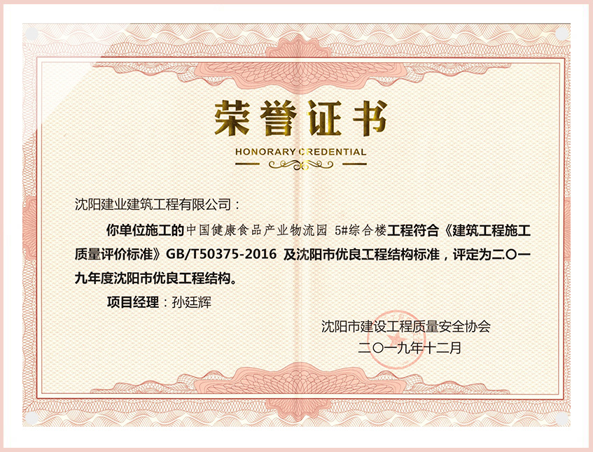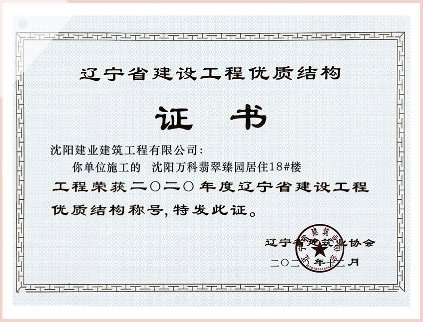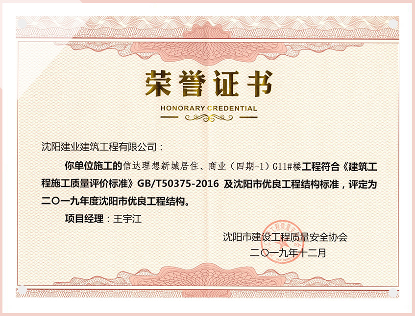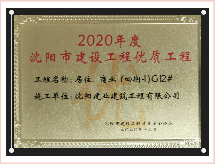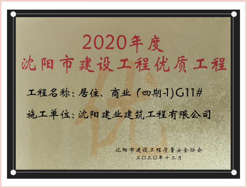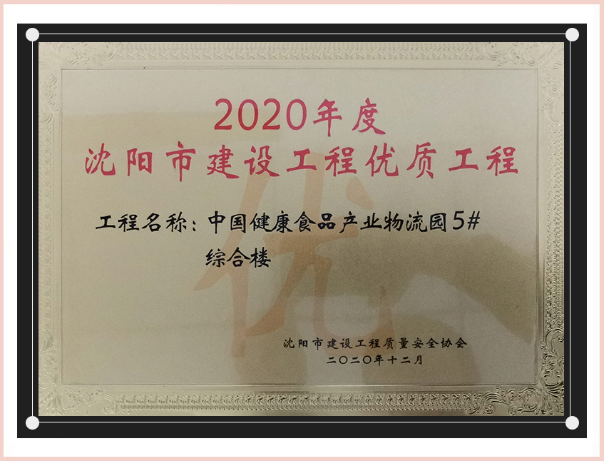 工程質(zhì)量多次進(jìn)入遼寧省前十名,其中多個(gè)項(xiàng)目獲得“遼寧省優(yōu)質(zhì)結(jié)構(gòu)”、“沈陽(yáng)市優(yōu)質(zhì)結(jié)構(gòu)”、“沈陽(yáng)市優(yōu)良工程”、“新貌杯”、“玫瑰杯”、“沈長(zhǎng)哈三市優(yōu)質(zhì)金杯獎(jiǎng)”、“沈陽(yáng)市民營(yíng)企業(yè)規(guī)模百?gòu)?qiáng)”、“沈陽(yáng)市模范勞動(dòng)關(guān)系和諧企業(yè)”、“沈陽(yáng)市先進(jìn)施工單位”等多項(xiàng)獎(jiǎng)項(xiàng)。